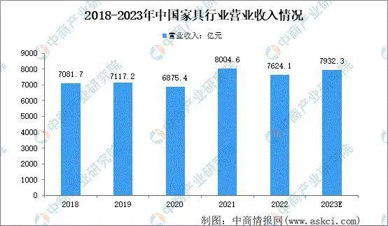 數(shù)據(jù)顯示,2022年受疫情和外貿(mào)等因素影響,我國家具行業(yè)規(guī)模以上企業(yè)實(shí)現(xiàn)營業(yè)務(wù)收入7624.1億元,同比下降-4.8%。回顧2018-2022年家具制造業(yè)營業(yè)收入情況:近年來,我國家具制造業(yè)營業(yè)收入總體呈小幅度下降趨勢,預(yù)計(jì)2023年我國家具行業(yè)復(fù)蘇營業(yè)收入將達(dá)7932.3億元。