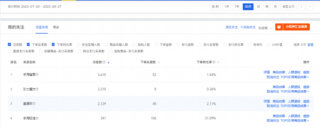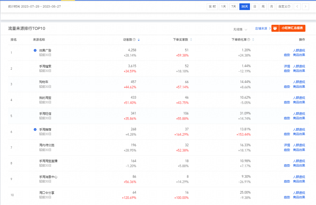 3.店鋪核心詞和轉(zhuǎn)化人群確定之后,看整體店鋪流量結(jié)構(gòu),流量結(jié)構(gòu)轉(zhuǎn)化率對比,免費(fèi)流量轉(zhuǎn)化高就重點(diǎn)規(guī)劃周期增加免費(fèi)渠道流量,優(yōu)化店鋪人群,階段轉(zhuǎn)化穩(wěn)定提高。