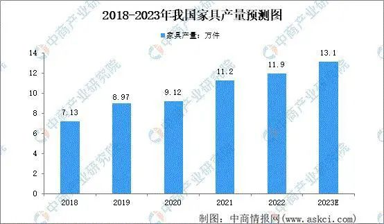 作為全球家具生產(chǎn)中心,早在2006年中國家具產(chǎn)業(yè)產(chǎn)值已躍居世界第一位,中國已然成為世界家具生產(chǎn)、消費(fèi)及出口大國。2022年我國家具業(yè)產(chǎn)量11.9萬件,同比增長5.9%。預(yù)計(jì)2023年我國家具行業(yè)產(chǎn)量將達(dá)13.1萬件,同比增長10.05%。