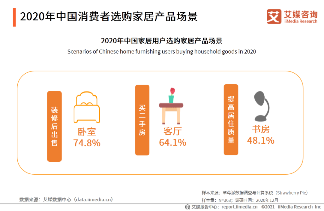 調(diào)查顯示,2020年,中國家居用戶選購家居產(chǎn)品場景分布中,“裝修后出售”為臥室購買家居產(chǎn)品的占比最高,為74.8%;裝修原因?yàn)椤百I二手房”中,為客廳購買家居產(chǎn)品的占比最高,為64.1%;為“提高居住質(zhì)量”而為書房購買家居產(chǎn)品在各場景中占比最高,為48.1%。臥室作為人們進(jìn)行睡眠放松的場所,勢必成為家居用戶“裝修后出售”而購買家居產(chǎn)品的首選。