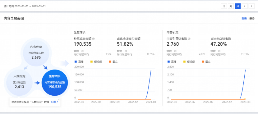 女裝店鋪面對(duì)廣大女性用戶,這一群體對(duì)愛(ài)美有著極大的興趣,而抖音直播間(興趣電商)的搭建,恰好為李萌(化名)的女裝店鋪提供了一個(gè)絕佳的流量通道,于是火蝠幫助李萌重新優(yōu)化直播間的裝修風(fēng)格,直播節(jié)奏,以及內(nèi)容話術(shù)來(lái)吸引消費(fèi)人群,助力女裝店鋪完成沖刺目標(biāo)從而實(shí)現(xiàn)彎道超車,最終在直播賽道取得矚目成績(jī),內(nèi)容種草2695人,累計(jì)粉絲數(shù)2413,直播成交19萬(wàn)。