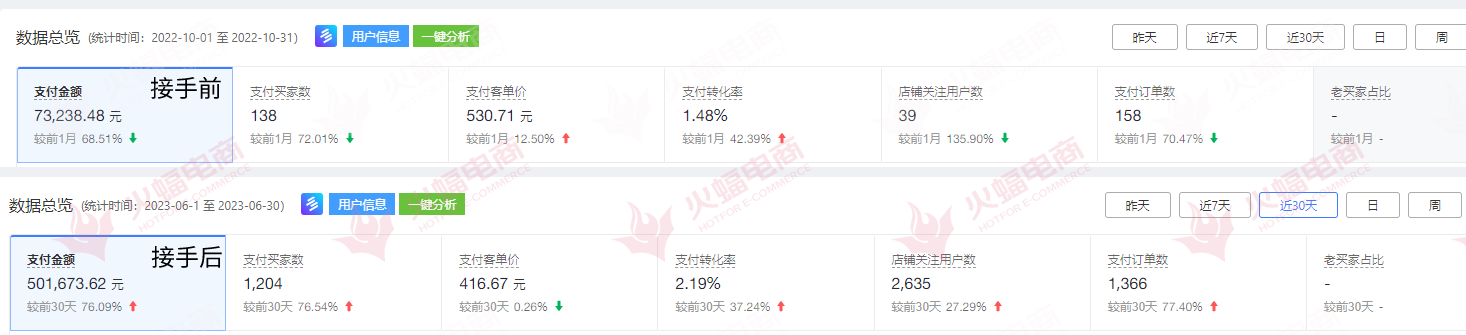 確定了人群定位,運(yùn)營(yíng)團(tuán)隊(duì)從各個(gè)渠道入手,將產(chǎn)品投放關(guān)鍵詞鎖定在「家用」「學(xué)生」「輔導(dǎo)」「二手」上。雖然有價(jià)格優(yōu)勢(shì),但因銷售的是二手產(chǎn)品,無法參與平臺(tái)官方大促活動(dòng),只能采取「限時(shí)限量購(gòu)」來壓縮價(jià)格,以8折的力度進(jìn)行設(shè)置,刺激消費(fèi)者進(jìn)行轉(zhuǎn)化。在分析付費(fèi)推廣數(shù)據(jù)時(shí),夢(mèng)潔(花名)發(fā)現(xiàn),「搜索場(chǎng)景端」的推廣花費(fèi)很高,但ROI僅在9左右,產(chǎn)出并不高。因此,在穩(wěn)定店鋪流量的同時(shí),團(tuán)隊(duì)把兩個(gè)主推款型號(hào)轉(zhuǎn)到全站推廣,其余型號(hào)的打印機(jī)用免費(fèi)流量做轉(zhuǎn)化,減少「搜索場(chǎng)景」的花費(fèi)占比,優(yōu)化推廣策略,最終ROI從9提升到16.61,幫組商家實(shí)現(xiàn)降本增效。在團(tuán)隊(duì)努力精細(xì)化運(yùn)營(yíng)之下,不僅超預(yù)期完成了上半年的經(jīng)營(yíng)指標(biāo),也為店鋪下半年沉淀了堅(jiān)實(shí)的基礎(chǔ),代運(yùn)營(yíng)效果受到品牌商家王勇(化名)的充分認(rèn)可。