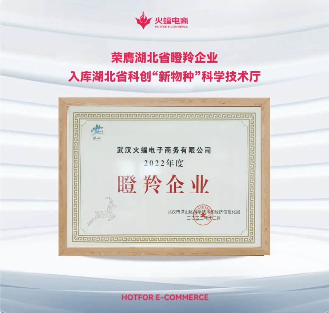 長期以來,火蝠電商堅持在技術研發等方面持續投入,通過技術創新與前瞻式布局,為品牌提供火蝠9年零售數字化經驗和60+國內領先品牌一站式技術解決方案除此之外,在剛剛過去的2022年,火蝠電商憑借自身扎實技術與專業服務能力,榮獲“瞪羚企業”稱號,入庫湖北省科創”新物種“  科學技術,獲得外界的高度認可。
